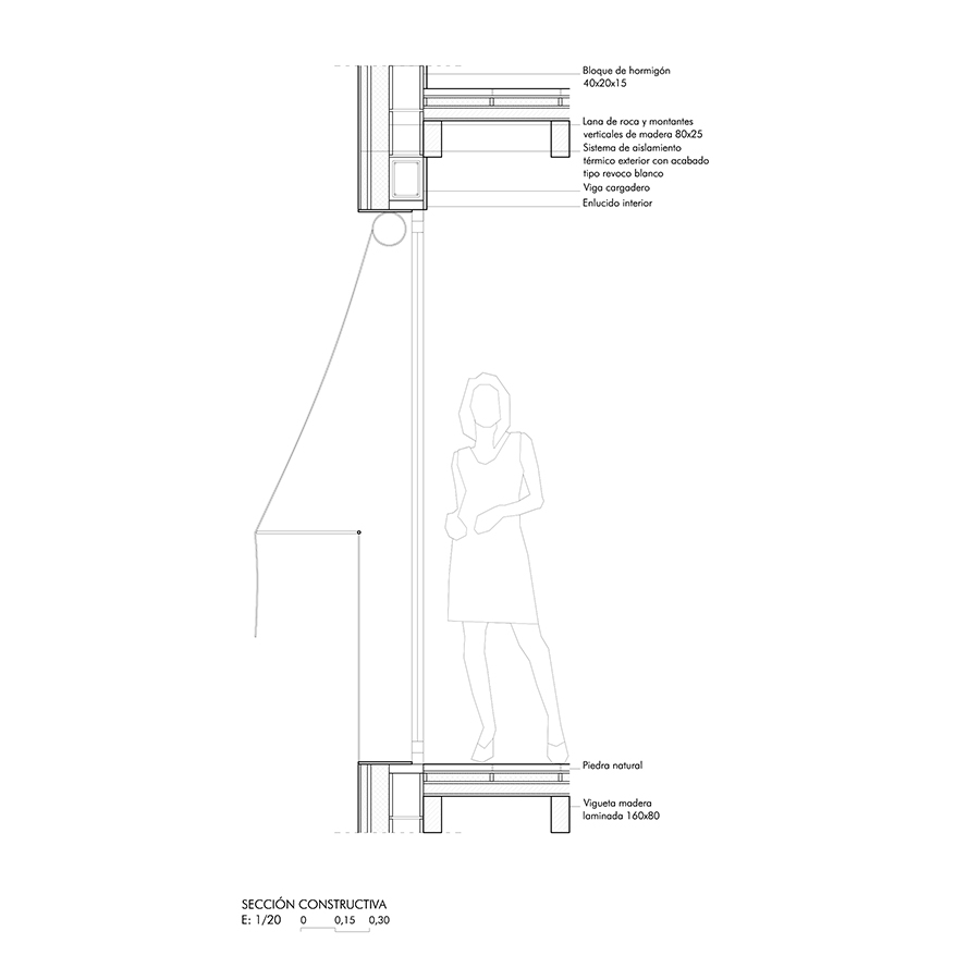 Los tres bloques que conforman la propuesta se organizan en el perímetro del área de movimiento, permitiendo que todas las viviendas y locales tengan doble orientación. El acceso al edificio se realiza mediante unas pasarelas que vuelan sobre la mina. El espacio comprendido entre el edificio y la calle sirve como filtro natural entre lo público y lo privado, generando una protección a nivel bioclimático y acústico.